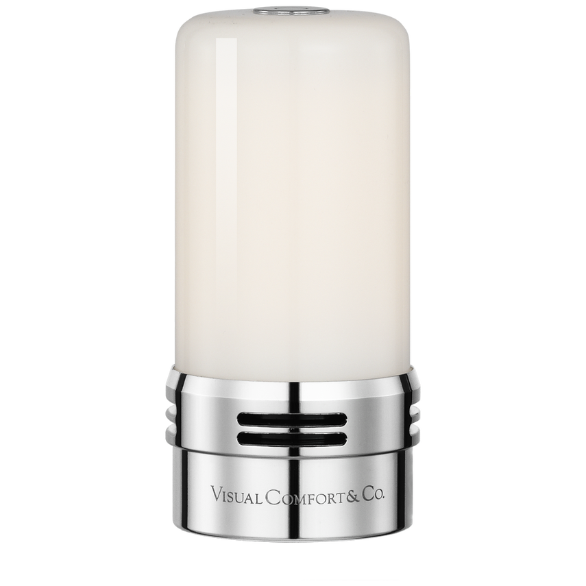 A compact, rechargeable LED module featuring integrated dimming via touch control. Outputs 250 lumens from a 2 W LED, enclosed in nickel-finish housing with white glass diffuser. Measures 4″ H × 2″ W, weighs approximately 1 lb. Includes built-in lithium-ion battery (non‑replaceable), USB‑C charging, ETL‑damp rated. Battery fully charges before use and cycles through low‑medium‑high light levels. Module base sold separately