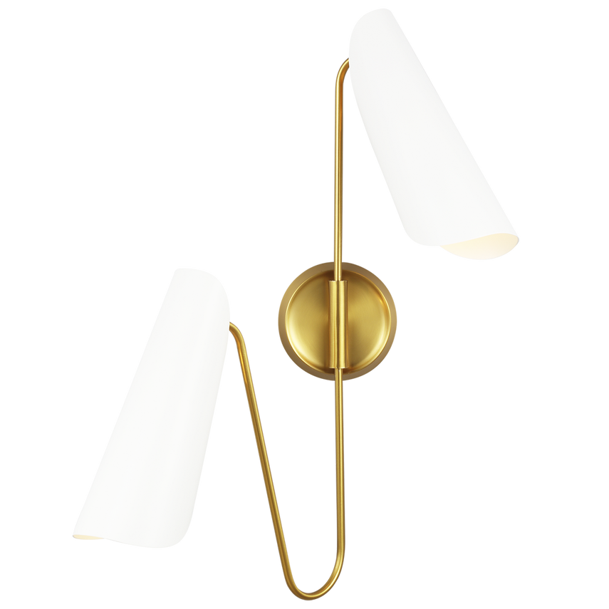 Two-light sconce with slender arms and fabric shades, polished nickel finish. Classic style for bedrooms or living rooms.
